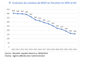 Dans le cadre de la "mission IGAS sur une éventuelle mise en extinction du corps des médecins inspecteurs de santé publique", le SGMAS et la DRHm ont produit en avril 2024, une monographie décrivant la situation démographique du corps qui est aujourd’hui catastrophique.